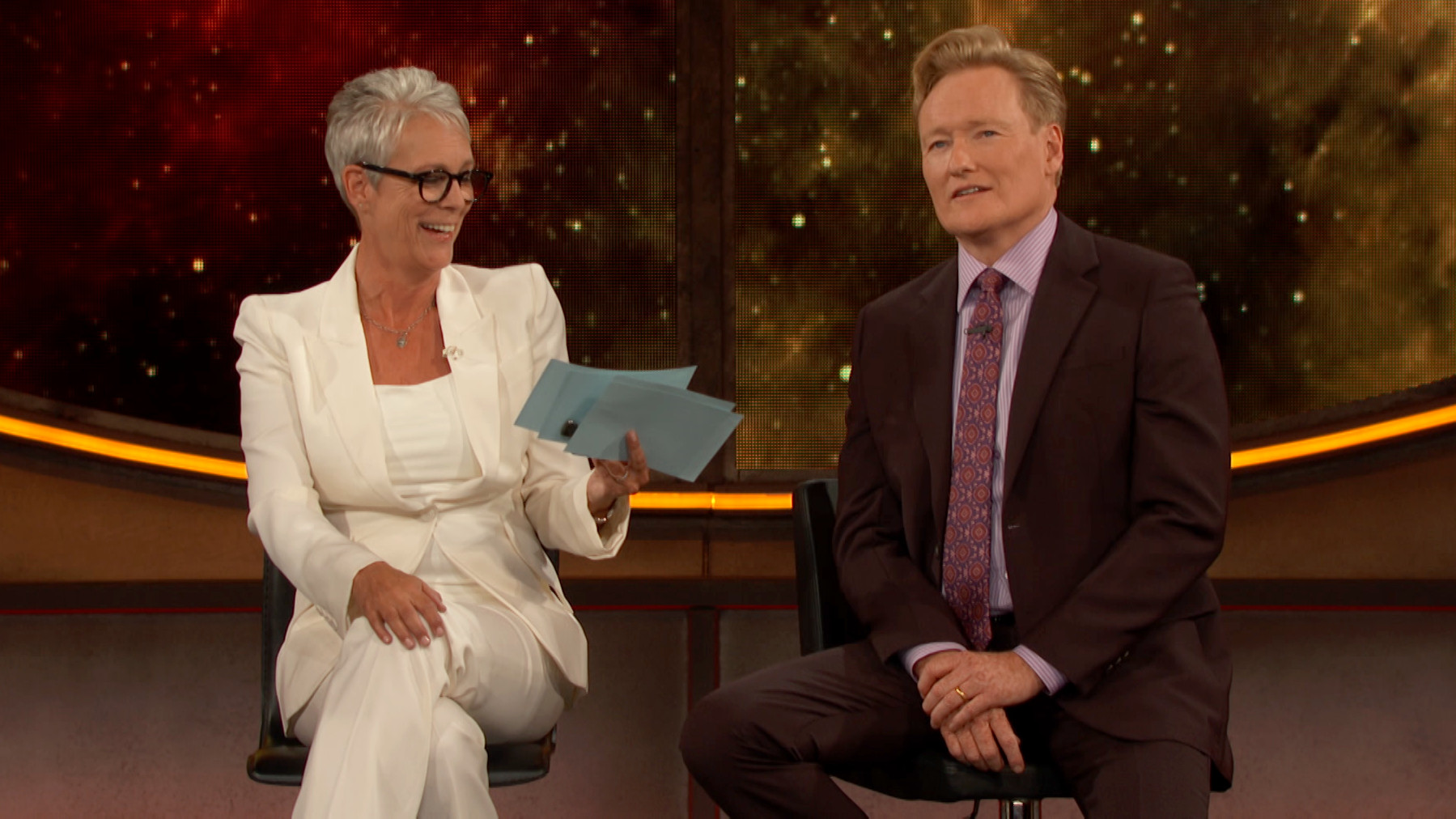 Sunday, July 22, 2018"Halloween" star and Scream Queen Jamie Lee Curtis administers Conan’s Comic-Con® Citizenship Test.
