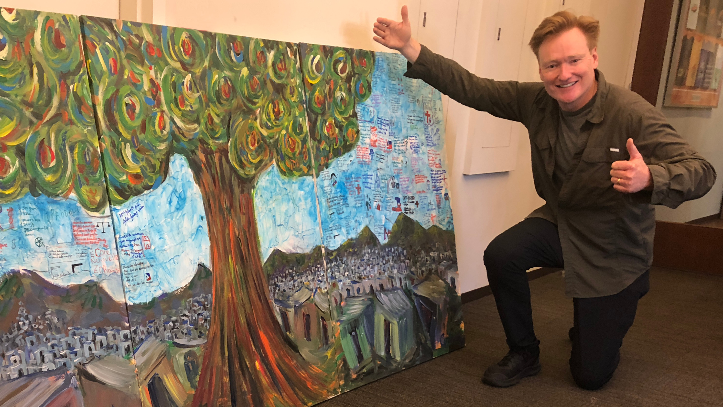 Tuesday, June 12, 2018Conan thanks his young friends at Ecole Nouvelle Zoranje in Haiti for sending him a beautiful mural and apologizes once again for his freckles. Watch the making of the mural @ teamcoco.com/prodev.