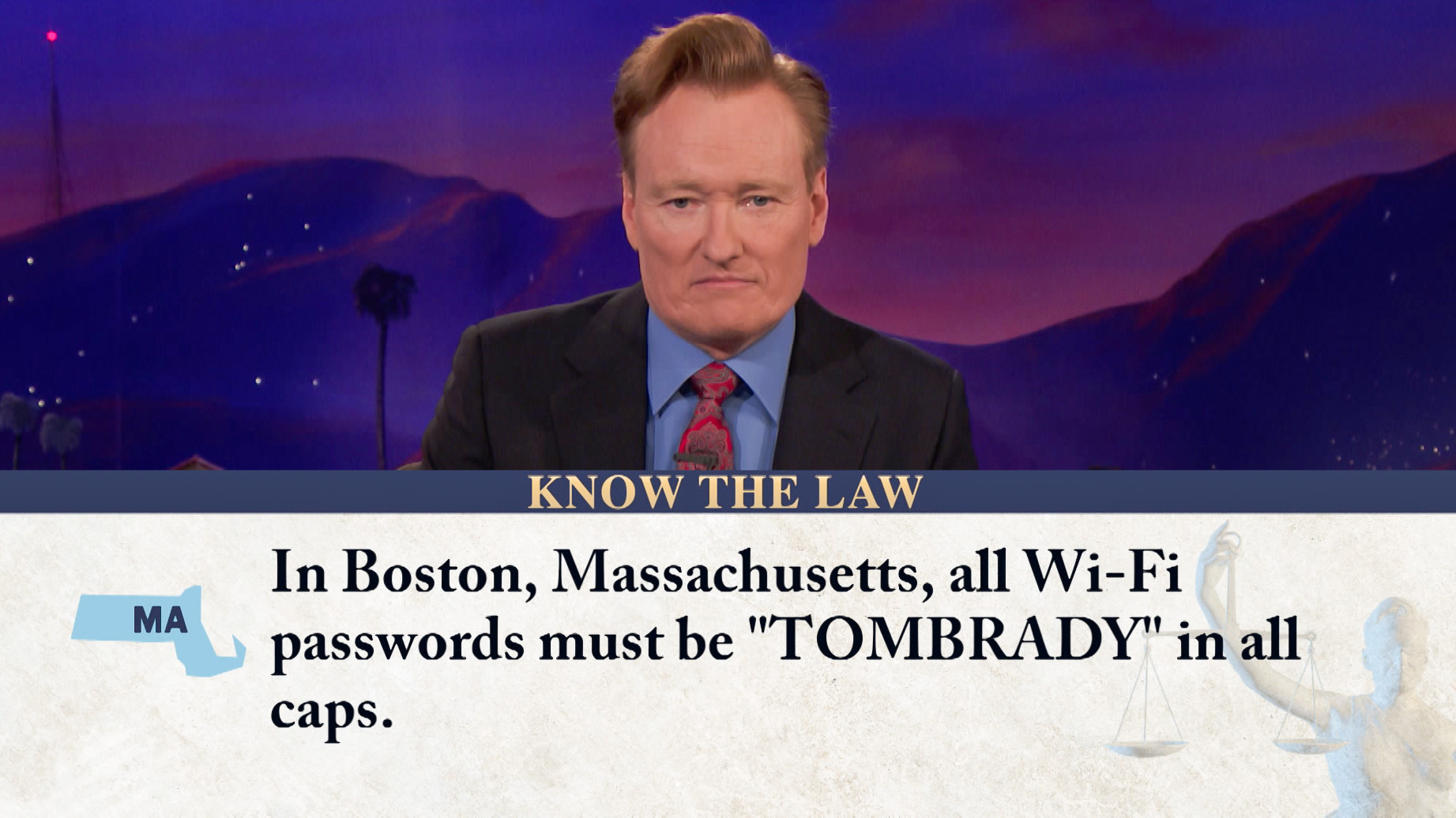 Wednesday, February 7, 2018In Boston, Massachusetts, all Wi-Fi passwords must be "TOMBRADY" in all-caps.