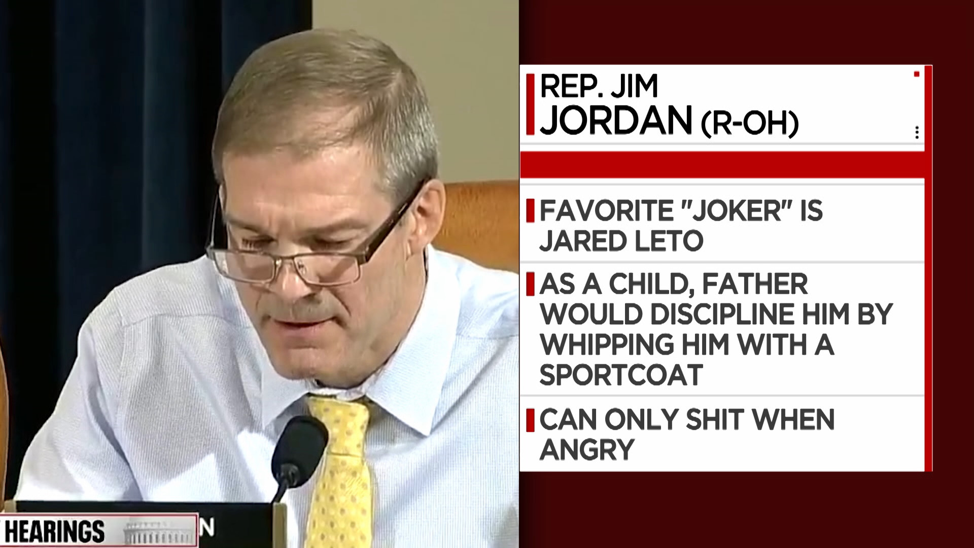 Thursday, November 14, 2019CONAN Highlight: Thanks to CBS, we now know that Congressman Mike Quigley considers eye contact to be third base and Congressman Jim Jordan can only shit when he’s angry.