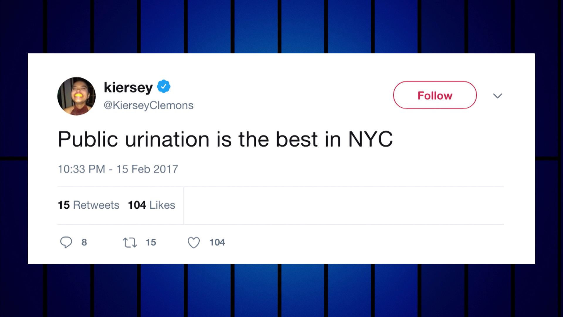 Tuesday, May 22, 2018Kiersey thinks New York City smells like pee anyway, so why not...