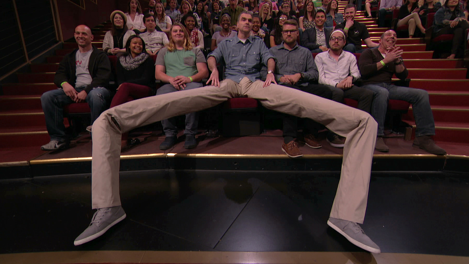 Wednesday, March 9, 2016Conan just learned about the nasty habit of men who sit with their legs splayed open, and sure enough, there's a manspreader right up front.